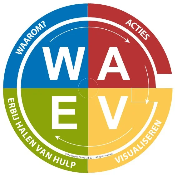 Door het gebruik van een gezamenlijke definitie (de kleuren), ontstaat er een podium om het gesprek met elkaar aan te gaan voor teamomwikkeling. De inzichten hiervan gebruiken wij voor het vergroten van de effectiviteit van individuen, teams en organisaties.